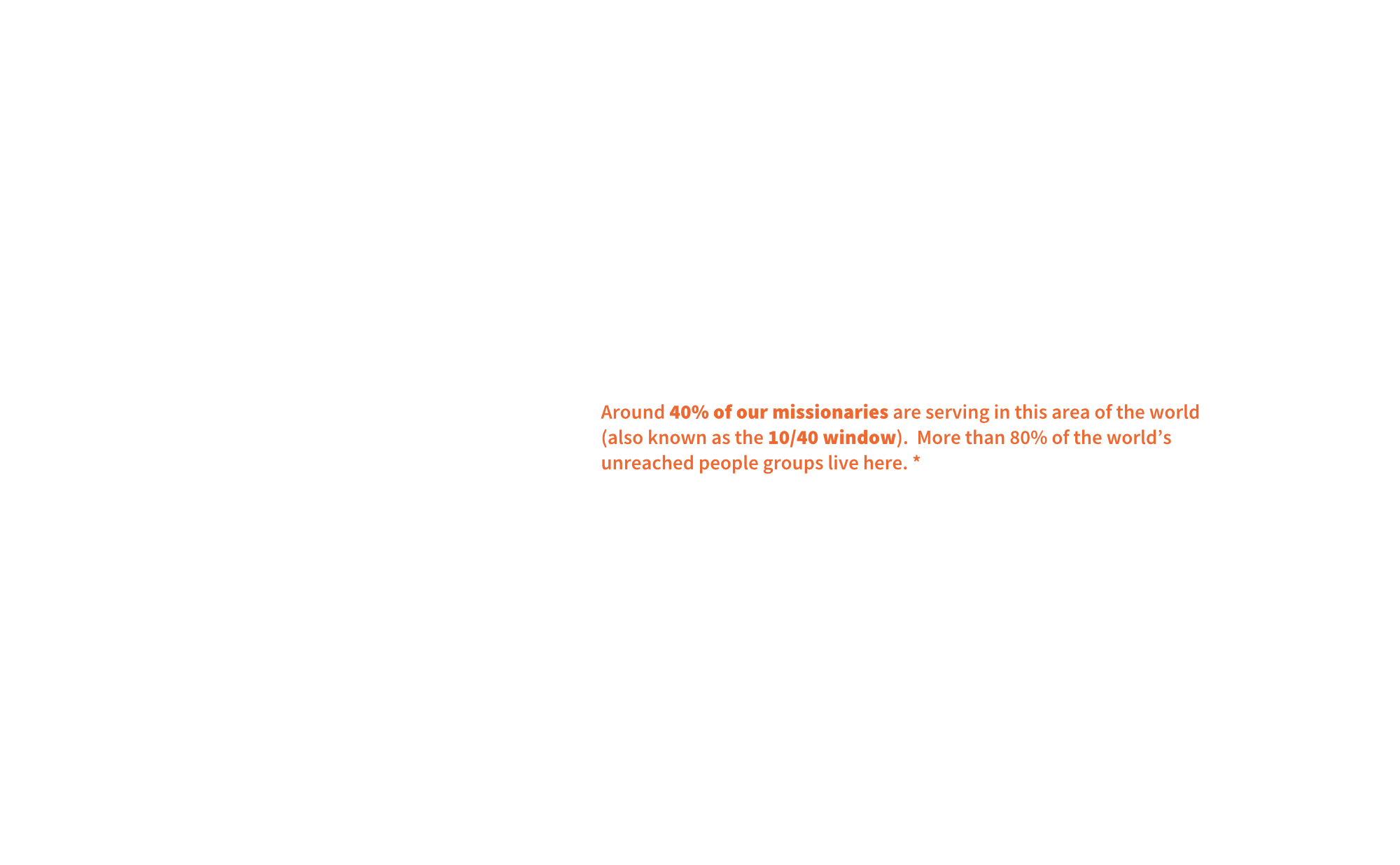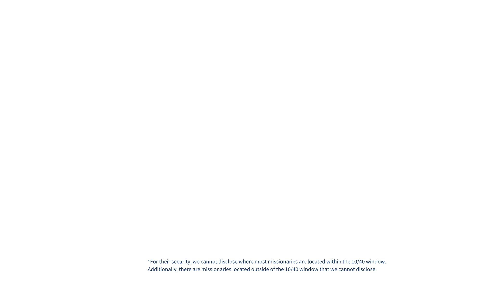 *We cannot disclose where most missionaries are located within the 10/40 window, due to security guidelines. Additionally, there are missionaries located outside of the 10/40 window that we can’t disclose due to security guidelines.